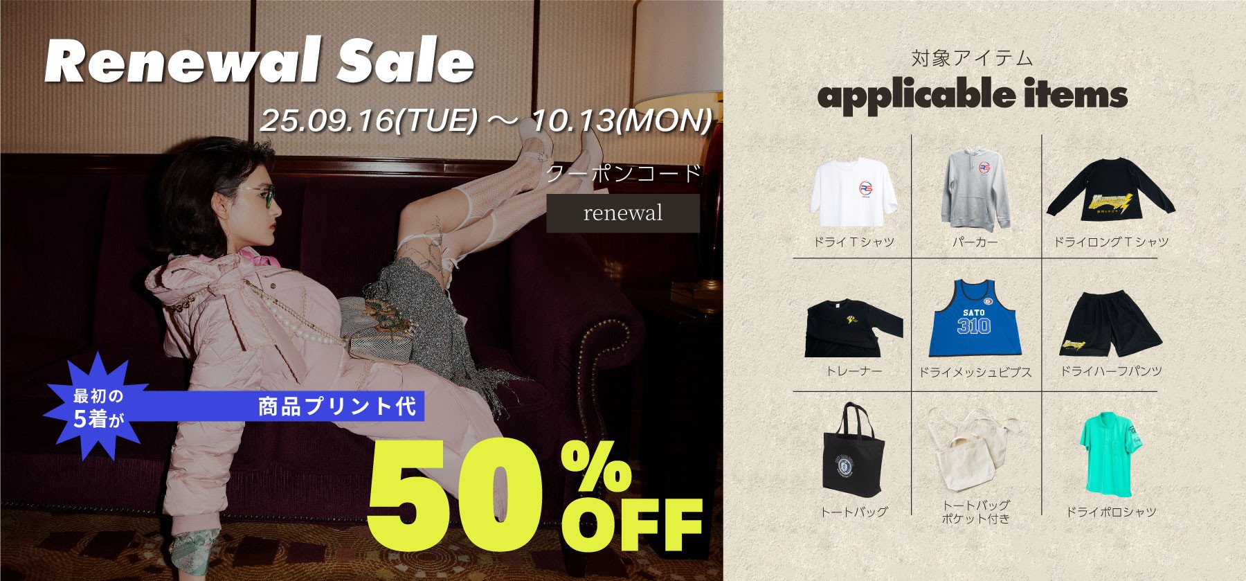 ・セール内容:プリント商品ご注文の際のプリント代が、最初の5着分50%OFFになります。